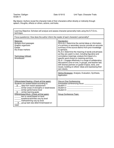 Character Lesson: Teaching Positive Traits. Lesson Plan. Preparation Begin by selecting one or more character traits for class discussion. If desired, teachers can devote an entire class session to each trait over the course of the school year. I’m only student teaching but still. I have 1 planning period a day. My mentor teacher has me scheduled to take over 1 class next week, 3 the following, and all of them the following. Despite being the same 2 subjects and grade, somehow none of the classes are on the same chapters/at the same point in the curriculum. I have 1 planning period and 1 lunch and for my university I have to write out detailed plans that detail exactly which state standard each lesson and activity meet. This week w... Character Analysis Lesson Plan. Instructor: Sharon Linde. Show bio. And then I busted out a character analysis lesson plan from 1972. It was a dismal failure. 4 kids still have not come out of their boredom-induced coma. Literary Character Analysis Lesson Plan Instructions. We're gonna characterize these characterization lesson plan by calling them dynamic and engaging. The short stories for teaching characterization bundle contains complete short story units for the following...
