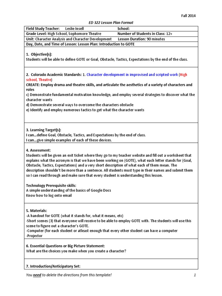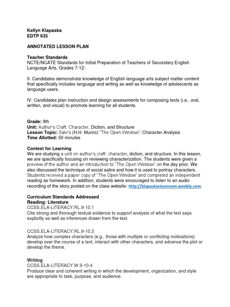SaveSave character analysis lesson plan For Later. 0%0% found this document useful, Mark this document as useful. Standard(s): What standards is this lesson accomplishing? NCAS Anchor Standards 4: o Students will select, analyze and interpret artistic work for presentation.