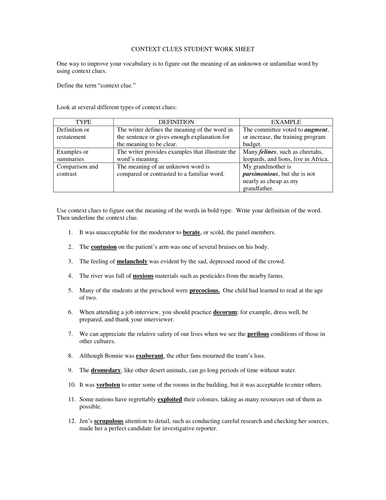 Context Clues Worksheets | edHelper Choose activities for any level, elementary through high school, that encompass different types of clues: synonym, antonym, example, explanation, comparison, and contrast. Students will match items, write their own definitions and explanations, and examine context clues within provided sentences.
