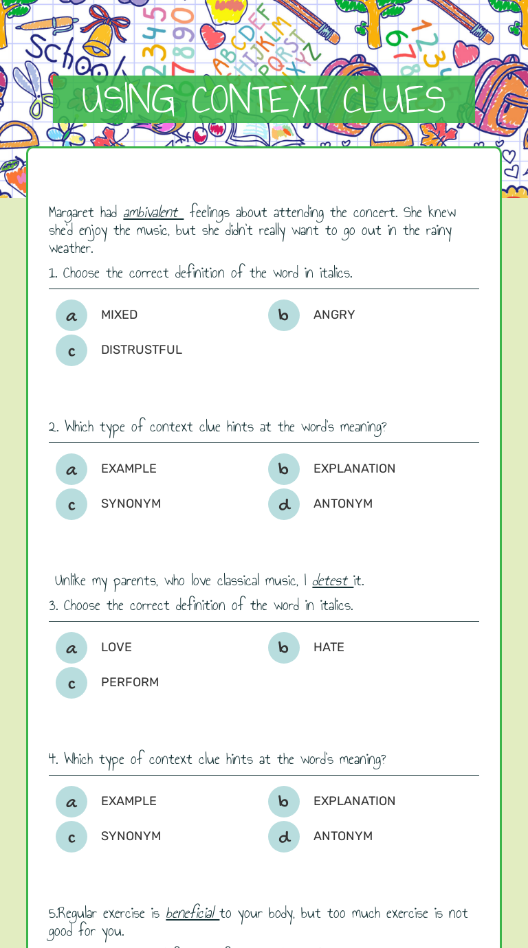 Context Clues worksheets and online exercises Free interactive exercises to practice online or download as pdf to print. Context Clues Graded Assignment Grade/level: 4th by laurenbradley.