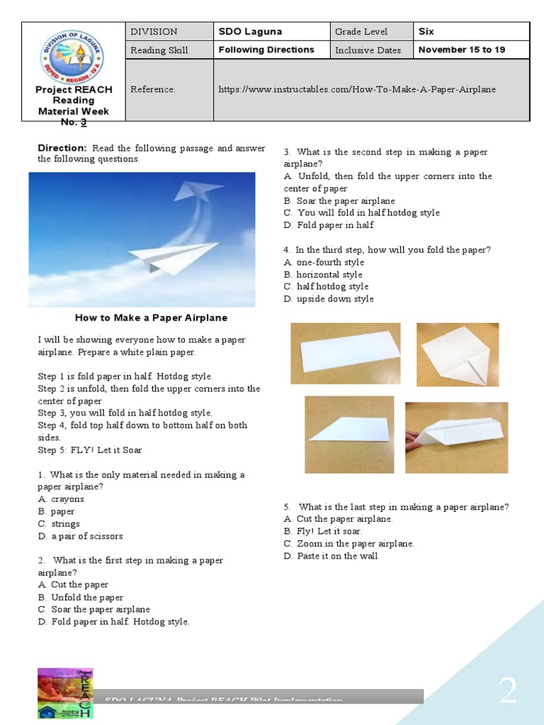 Following Directions Worksheets - English Worksheets Land Following Directions Worksheets To Print: Flying a Plane! - Make your first paper airplane flight smooth and then try it again. See if you flight lasts longer the more often you make them. See which modifications help it fly better. List Mania - You might want to time this one and see how accurate and quickly you can get it done.