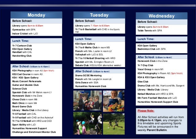 Sep 25, 2020 - Explore Nat Hat's board "Enrichment clubs and afterschool club ideas" on Pinterest. See more ideas about crafts, crafts for kids, afterschool activities. Most after school programs take a holistic approach to a child's well-being, evaluating how it can make a child more socially engaged, physically and emotionally cared for, and more committed to academics. Your program focus, like an arts program or focus on math homework completion, should complement those fundamental needs.