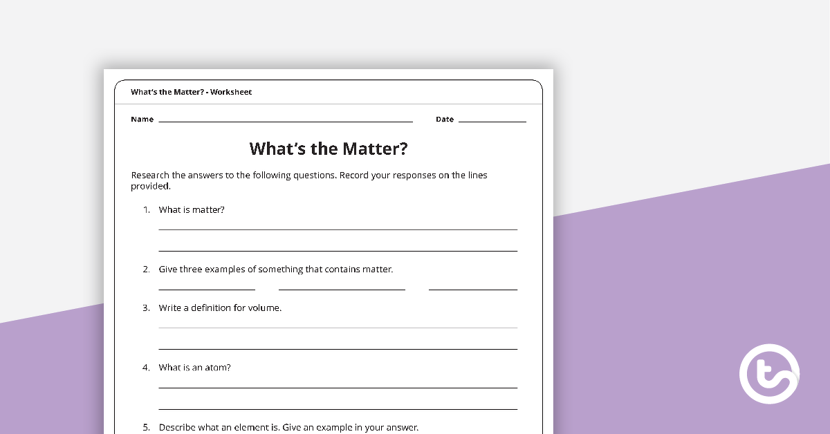 What's the Matter? #2 | Worksheet | Education.com Worksheet What's the Matter? #2. Is jello a solid, liquid, or gas? Help your fourth grader get ahead in science with this worksheet that challenges him to identify different states of matter. After he's done classifying each item as a solid or liquid, he'll use his answers to uncover a fun fact about gas. What's the Matter? Worksheet - Teach Starter A worksheet for students to record what they know about matter. Use this educational worksheet when exploring the concept of matter with your students. Students research the answers to the questions in order to accumulate scientific knowledge about matter. This teaching resource would be a wonderful addition to a lesson or unit in the Chemical ...