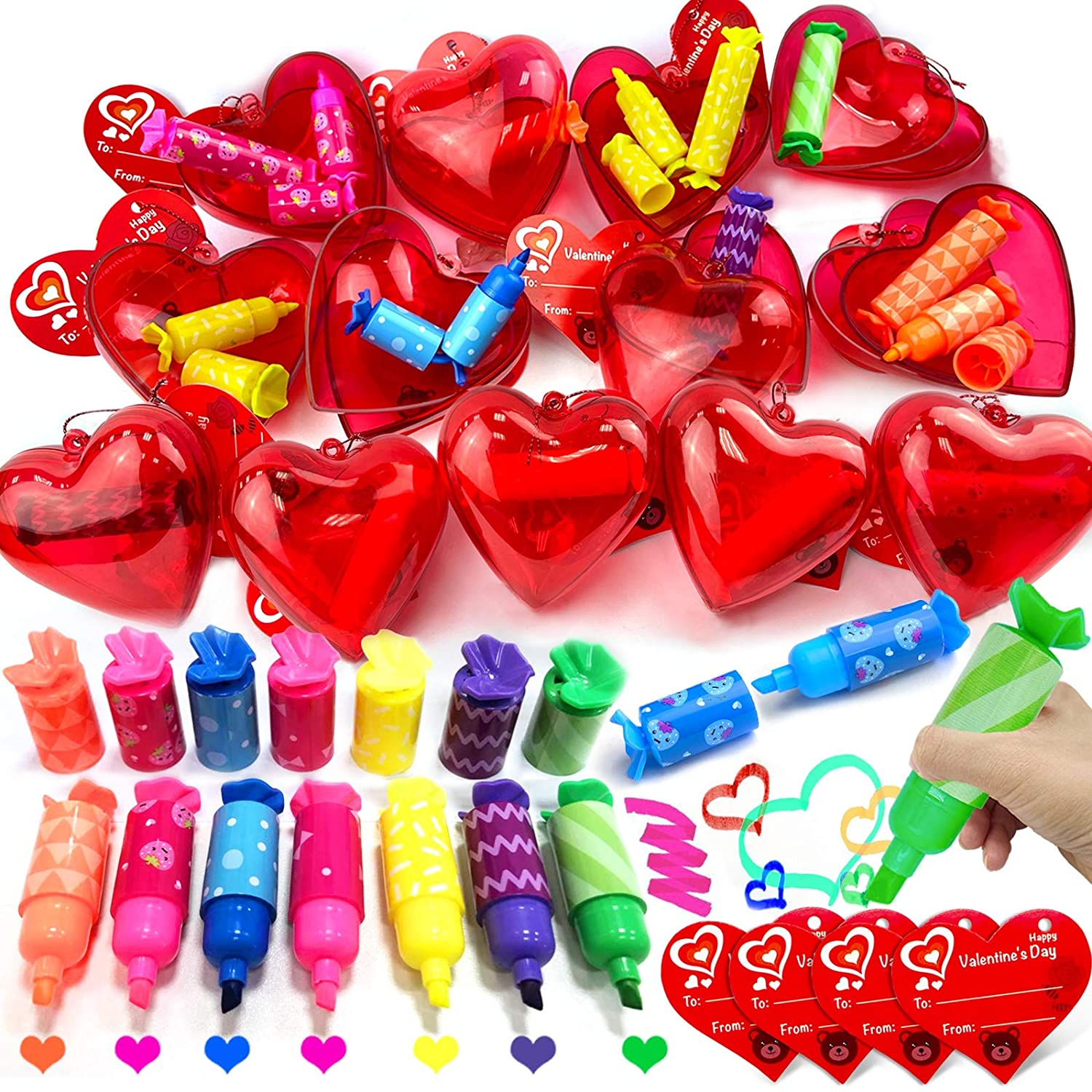 28 Pack Kids Party Favors 3.1'' Giant Heart Filled Candy Highlighter 7 Style Pen Birthday Gifts Cards for Boys Girls Classroom Exchange Party Supplies ...