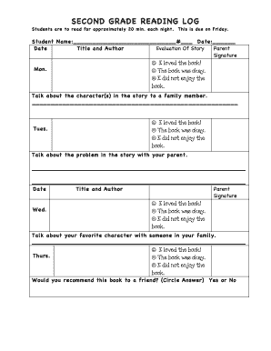 Reading log 5th grade. Editable Reading Log With Reading Comprehension Checks for ... These 5th grade reading logs and response journal prompts are the perfect way for your students to respond to their reading! We all know how important it is for our students to read outside of the classroom on a daily basis. But, do we really want them to fill out a reading log that just states the ... DOC 5th Grade Weekly Reading Log - qacps.org 5th Grade Weekly Reading Log. Directions: Part of your daily homework is to read for _20__ minutes. Complete . TWO of the activities listed below per week (all due on Friday) and you may complete only one per day. Remember to record which activity you completed each day in your agenda. Each activity should be dated and completed in your reading ... PDF 5th Grade Reading Log and Writing Responses chapter book ... 5th Grade Reading Log and Writing Responses People who read the most, read the best. The more you read and think about what you are reading, the better reader you become. In addition, when you write about something you read, your thinking and writing skills improve. You are required to read from a chapter book four nights a week. You must ... Reading Log Printable (5th - 8th Grade) - TeacherVision Reading Log. Help students with their organizational skills when they fill in this chart to keep track of books read and ones to be read.