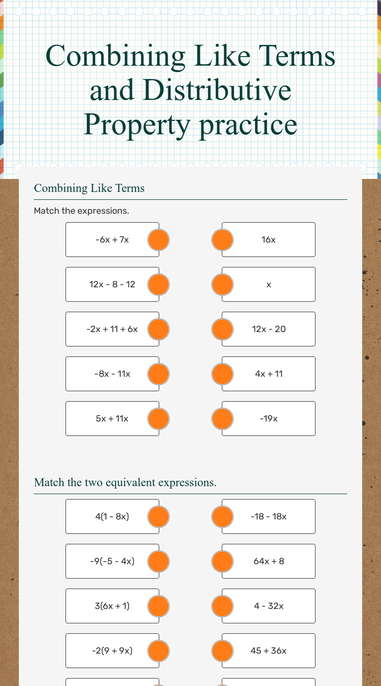 Combining Like Terms Worksheets - TheWorksheets.CoM ... Combining Like Terms Cards Cut out the pieces along the dotted lines. Each row is a separate expression. Use these cards on a board or projector to physically move the terms so that like terms are together. This, along with color coding like terms, can help struggling students to see what you are doing when you combine like terms.