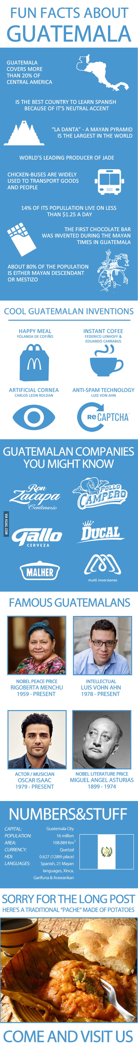 12 Guatemala Facts That You Probably Don't Know | Intrepid ... 12 facts you probably don't know about Guatemala Blue denim flourishes in Guatemala. Many Maya women are crafty textile producers. And Guatemala is actually a leader in... Guatemalans invented the first ever chocolate bar. All of us (well, the chocolate lovers among us) would agree with the... There ...