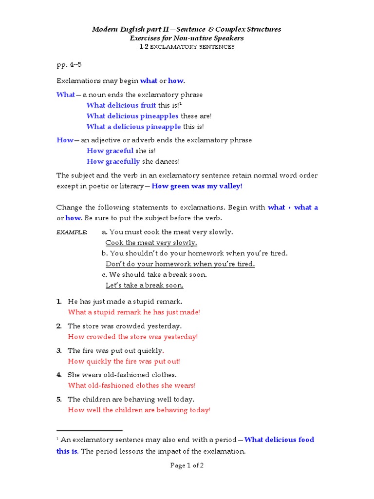 Exclamatory Sentence - IELTS BAND7 Apart from this there are two grammar rules associated with exclamatory sentences-: RULE 1-: If the noun in your sentence is plural, the correct choice is what and not how. For example-: What beautiful kids they are! //correct How beautiful kids they are! //incorrect RULE 2-: The exclamatory mark is placed always at the end of the sentence.