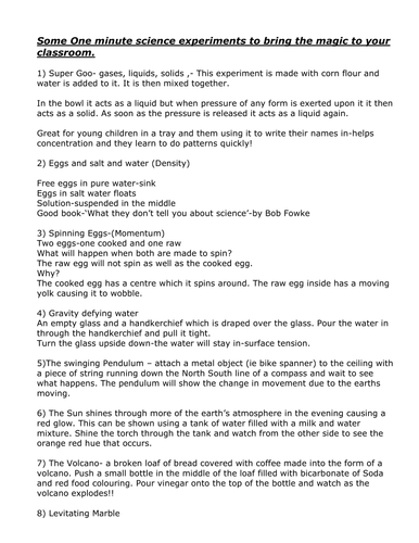31 Easy Science Experiments for Kids Here is a great experiment on crushing sugar in the dark to cause flashes of luminous blue light. Be sure to read the directions carefully. Make a rubber egg. This easy experiment takes a few days. Place a raw egg (in it's shell) in a jar and cover with white vinegar. Leave for 2 or 3 days. Your egg will turn rubbery. 32 SCIENCE EXPERIMENTS that will shock you || By 5-minute ... Timestamps:0:05 How to pour water from a glass to a glass without using your hands0:39 Colorful water1:20 Static electricity2:07 Ice and salt2:37 Oil and pai... 52 5 Minute Science Experiments ideas | science ... May 14, 2020 - Quick and easy 5 minute science experiments for kids that are ideal for preschool and kindergarten learning centers. See more ideas about science experiments, science experiments kids, experiments. Kids Science Experiments | Science Experiments for Kids ... Science experiments you can do at home! Explore an ever growing list of hundreds of fun and easy science experiments. Have fun trying these experiments at home or use them for science fair project ideas. Explore experiments by category, newest experiments, most popular experiments, easy at home experiments, or simply scroll down this page for tons of awesome experiment ideas!