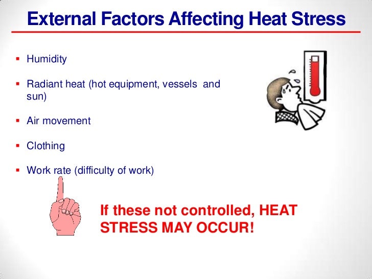 Heat Stress Guide | Occupational Safety and Health Administration Heat stress is a common problem encountered in these types of situations. The following frequently asked questions will help workers understand what heat stress is, how it may affect their health and safety, and how it can be prevented. ... (usually); hot, dry skin; and an abnormally high body temperature, e.g., a rectal temperature of 41°C ...