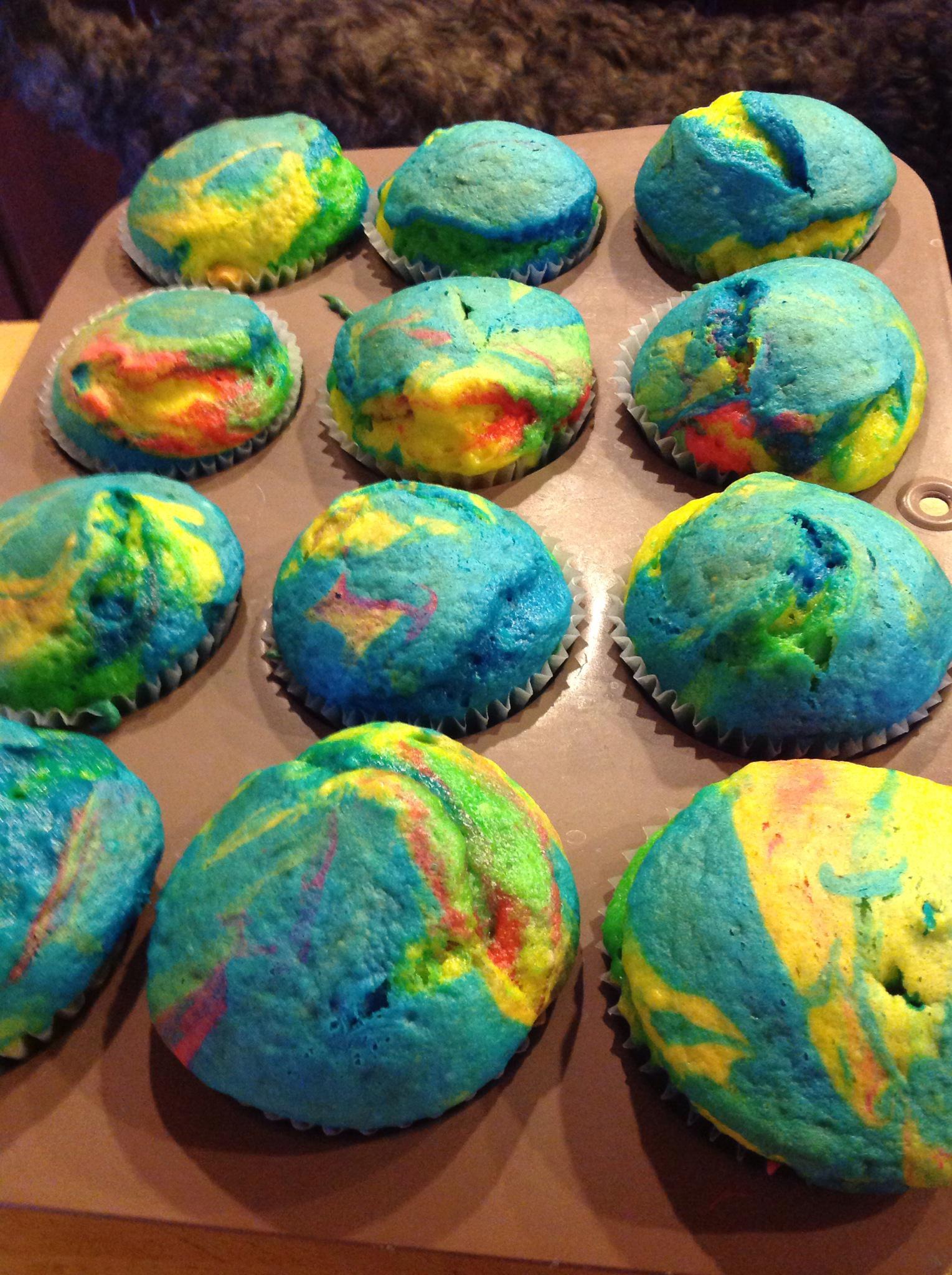 Tie Dye Cupcakes - Joyful Homemaking Add 1/4 cup of a different color to each bowl and mix with a spoon. Then spoon 2 Tablespoons full of each color into each cupcake liner. 1 cake mix makes 24 cupcakes. I even used a book under the pan so it would tilt a bit and keep the colors from running together so much, while I was filling the pan. Be careful not to overfill.