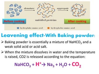 Chemistry of Baking Ingredients 1: How Much Baking Powder Do Quick ... One of the products of this chemical reaction is carbon dioxide gas, which provides the leavening for the baked product. As the batter is baked, the carbon dioxide produced by the baking powder makes bubbles in the batter. The bubbles are trapped by the surrounding structure of the batter, mainly supported by proteins in the flour and eggs.
