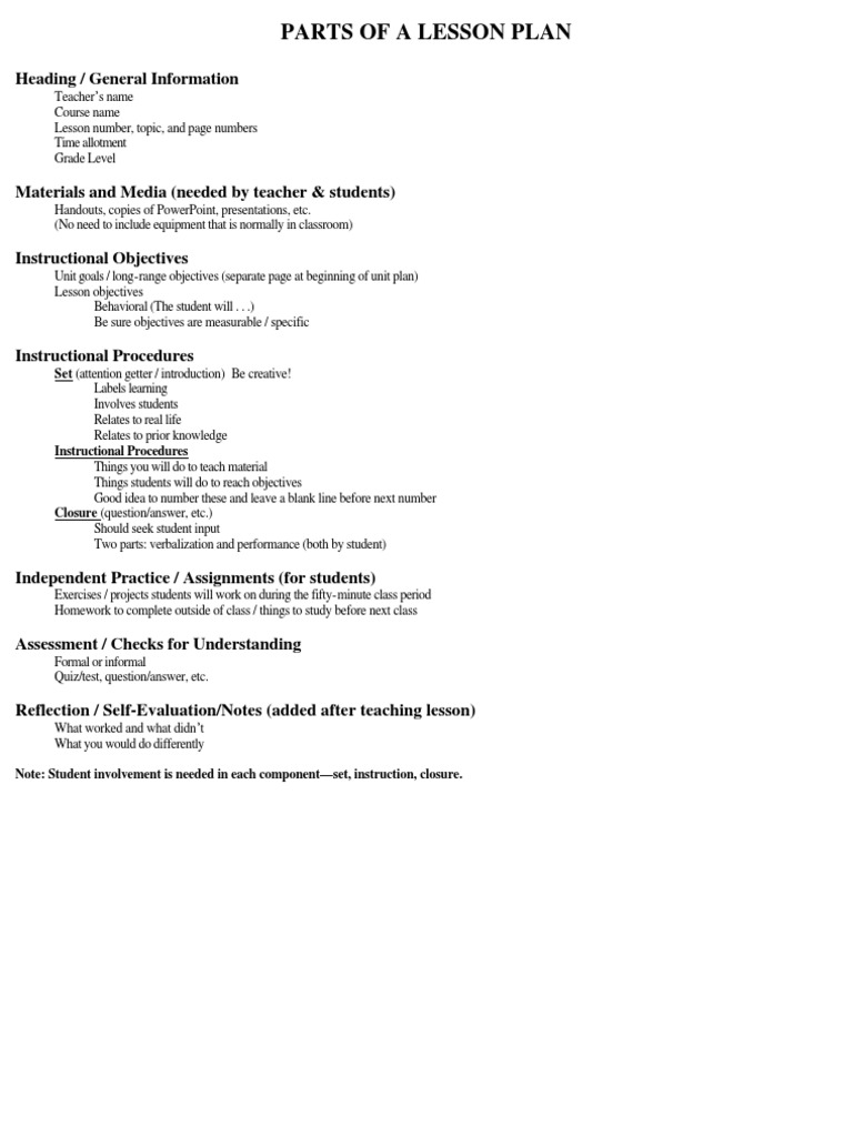What are the different parts of a lesson plan? - Quora Answer (1 of 3): If you're a college student, it's up to your professor. If you're a teacher, it's up to your administrator. It's been my experience that professors want much more detailed lesson plans than administrators. In some cases, administrators don't even check lesson plans, so it's rea...