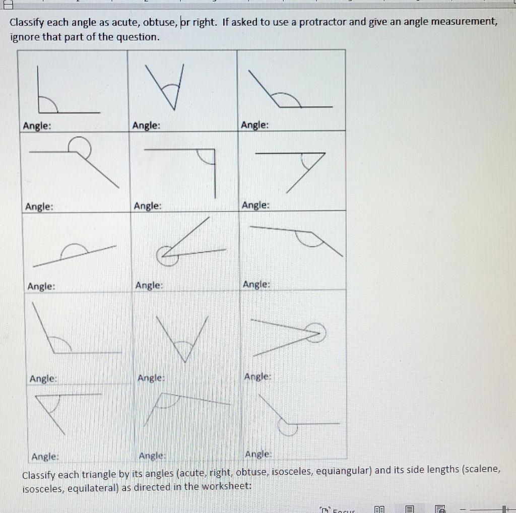 Types of Angles Worksheets | Math Fun Worksheets How do you classify angles? Angles are simply classified according to their magnitudes. To make it easy, draw a circle. Divide it into 360 equal parts. Every single part is 1º (one degree). One complete rotation of a ray about a point is divided into 360 equal parts. Types of angles: Zero angle: Exactly measures 0º . Acute angle: › worksheets › anglesMeasure and Classify the Angles Worksheet - Tutoringhour.com Including six angles for practice, this pdf worksheet helps reinforce students' expertise in types of angles and classifying angles. The task is for children to measure the given angles using a protractor and classify them as acute, right, obtuse, straight, or reflex, based on their measures. Measuring and Classifying Angles Worksheets - Easy Teacher Worksheets Once you know the measure of the angle we classify the angles. Straight angles are basically straight lines and have a measure of 180 degrees. Right angles measure 90 degrees. Acute angles are less than 90 degrees. Obtuse angles are the goldilocks of angles; they measure between 90 and 180 degrees.