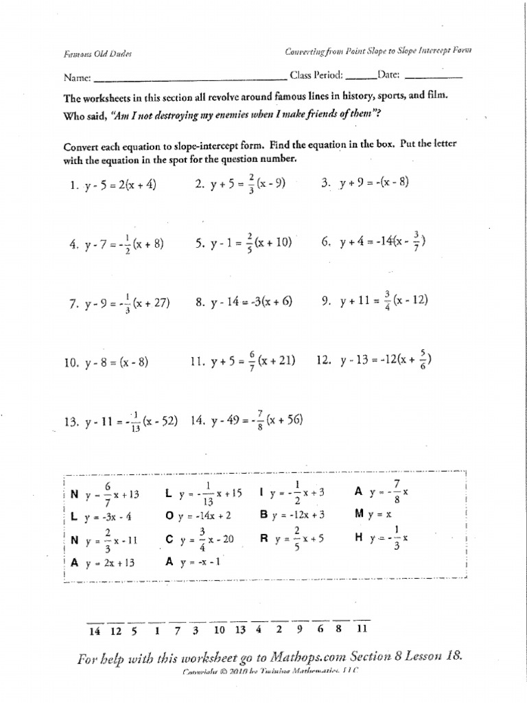 Point-Slope Form to Slope-Intercept Form Worksheet (with Answer Key ... The point-slope form of the equation of a line is useful when the slope and a point of a line are known. The slope-intercept form is the simplest form of the equation of a line. Mastering the skill of transforming the point-slope form to the slope-intercept form is the purpose of this worksheet.